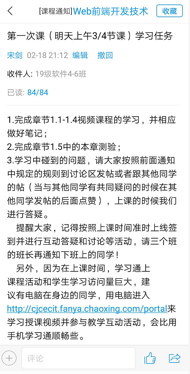 宋剑老师认真钻研了各类网络课程平台的使用方法,考虑到网络拥堵和不同学生的实际情况,最终选择了学习通平台录播授课,同时结合QQ群作为辅助。为上好每堂课,宋剑老师合理制定教学计划,广泛收集教学资料,精心做好教学设计,认真录制视频课程。课前通过学习通发布导学通知,引导学生进行课前预习,并在讨论区收集学生的疑问,便于在课堂上有针对性地进行讲解答疑。