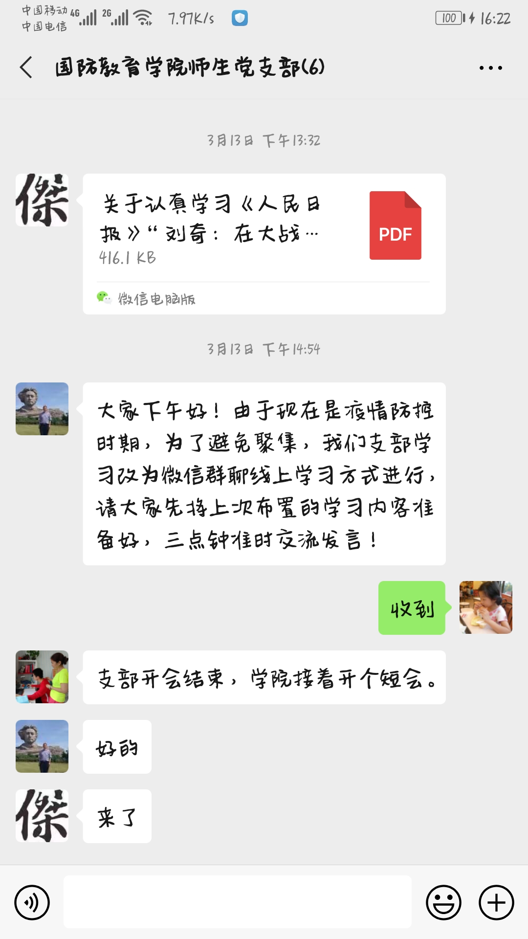 3月17日上午十点,学院组织全体党员利用微信视频的方式就学习情况谈心得体会。