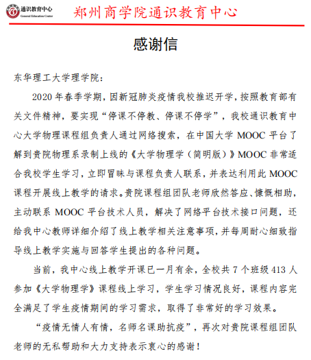 3月16日,理学院收到一封来自河南郑州商学院通识教育中心发来的一封感谢信,信中表达了在疫情期间,我校大学物理课程教学团队为该校开展《大学物理学》课程线上教学提供了无私帮助和大力支持,并表示衷心感谢。