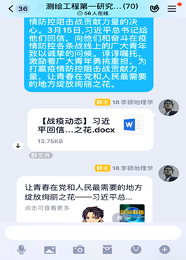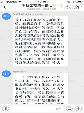 2018级党员陈涛说:“在这场疫情阻击战中,习总书记给北京大学援鄂医疗队全体“90后”党员的回信中勉励90后,更是对广大青年的期望和鼓励。面对疫情,新一代年轻人表现出勇敢的担当和不畏艰险的决心,更是党员同志对“到人民最需要的地方去”的时代召唤做出的强有力行动,也是我们党员同志和广大青年的初心。作为一名学生党员,我们应该在自己研究领域,努力学习技能,为社会主义建设贡献自己的力量。”