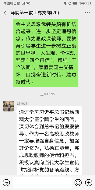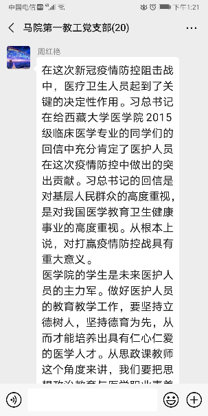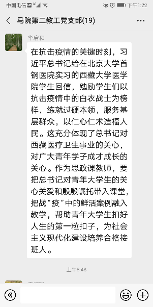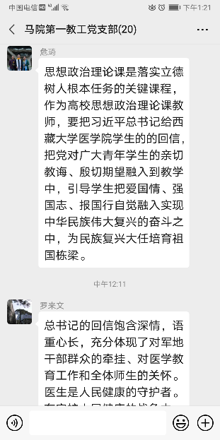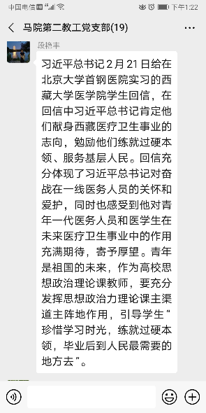 近日,习近平总书记给在首钢医院实习的西藏大学医学院学生的回信在高校引起强烈反响。马克思主义学院第一、第二教工党支部组织学习回信并进行线上交流学习。