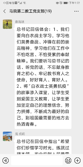 大家在学习交流中纷纷表示,习近平总书记的回信情深意切,寄托着对青年一代献身医疗卫生事业的希望和鼓励,也充分体现了党中央对边疆地区群众的关心和关怀,为我们推进教育事业发展指明了前进方向、提供了根本遵循、注入了强大动力。作为高校思政课教师,我们一定要把认真学习领会、全面贯彻落实习近平总书记重要回信精神与落实立德树人根本任务有机结合起来,把总书记对青年学生的关心关爱和殷殷嘱托带入课堂,把战疫中的鲜活案例融入教学,教育引导学生进一步树立正确的世界观、人生观和价值观,坚定“四个自信”,增强“五个认同”,厚植爱国主义情怀,自觉奋进新时代、建功新时代。 (文/付海莲)