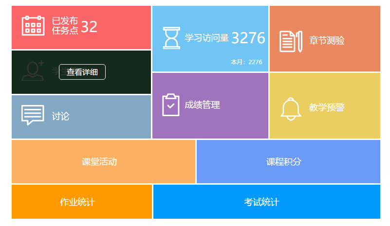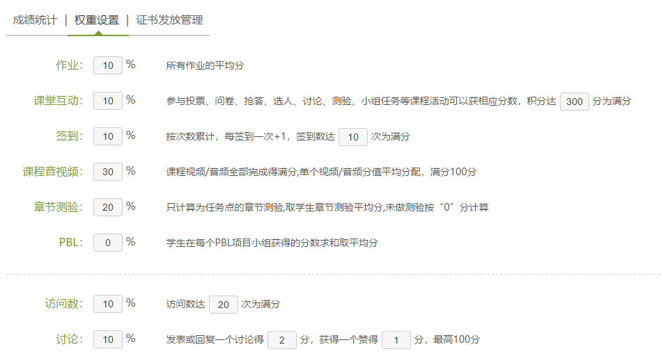 及时发布课程成绩的评定办法,加大平时成绩在总评中的比重。告诉学生平时成绩的评价种类多样,包括课程访问次数、签到率、在线测验数及成绩、作业完成数及质量、参与讨论次数、视频观看时长,回帖率、任务点完成数及比例,课程互动得分以及课程积分等。