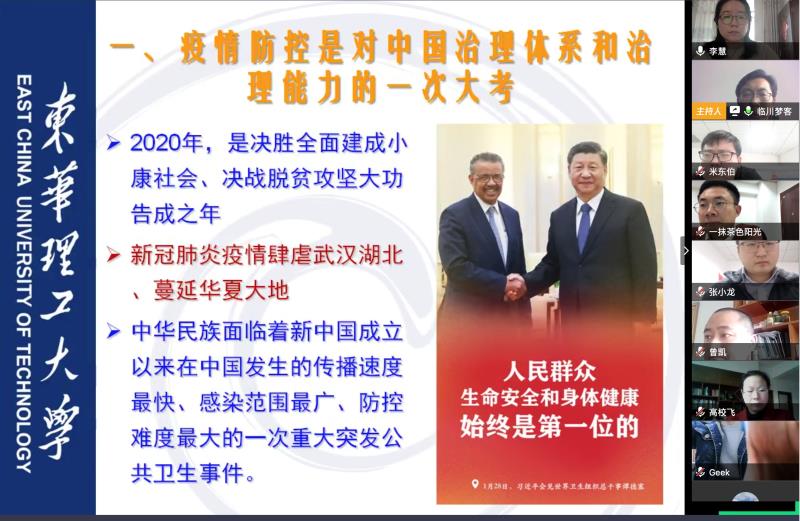 3月25日下午,质谱实验室党总支通过视频会议的形式,开展了新学期第一次开放式“云党课”,总支全体党员参与本次党课学习。党总支书记于涛作为主讲人,以“在抗击新冠肺炎疫情中答好十九届四中全会试卷”为题,围绕“疫情防控、要点解读、精神内涵、科技创新”四个方面,带领大家从抗击疫情的视角再次学习和理解了十九届四中全会的相关内容。