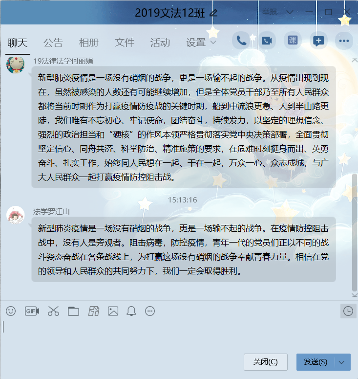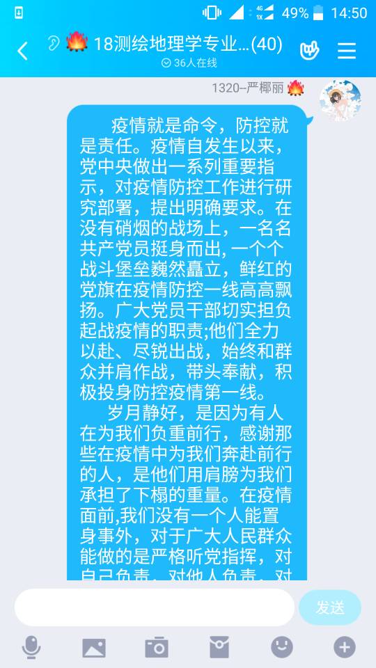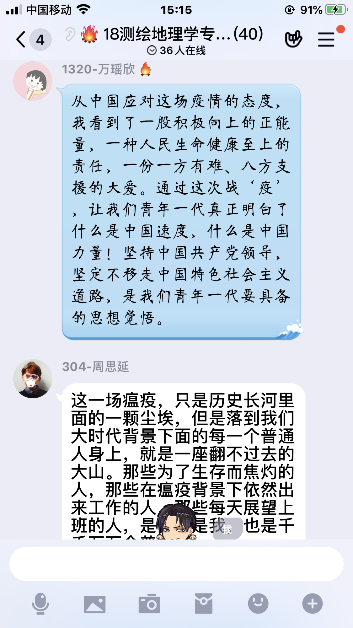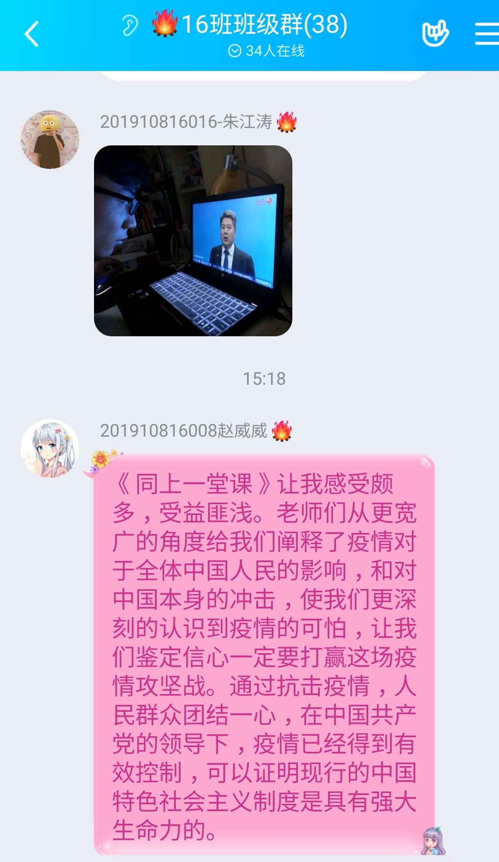 学科语文专业龙烨同学说:“今天这堂战“疫”课,我感动于在本次战“疫”中涌现出的先进人物事迹,我为我的国家,为我的民族倍感自豪。在抗击疫情中,中国共产党敢于担当,认真作为,保证了人民群众的生命安全,真正体现了为人民服务的宗旨。而西方的其他许多政府、政党,在本次战“疫”中,闹剧不断,高举民主与人权的大旗,却做着违背民主与人权的事情。这次战“疫”更加坚定了我的共产主义信仰,激发了民族自豪感,社会主义事业必将蒸蒸日上,中国加油,武汉加油!”