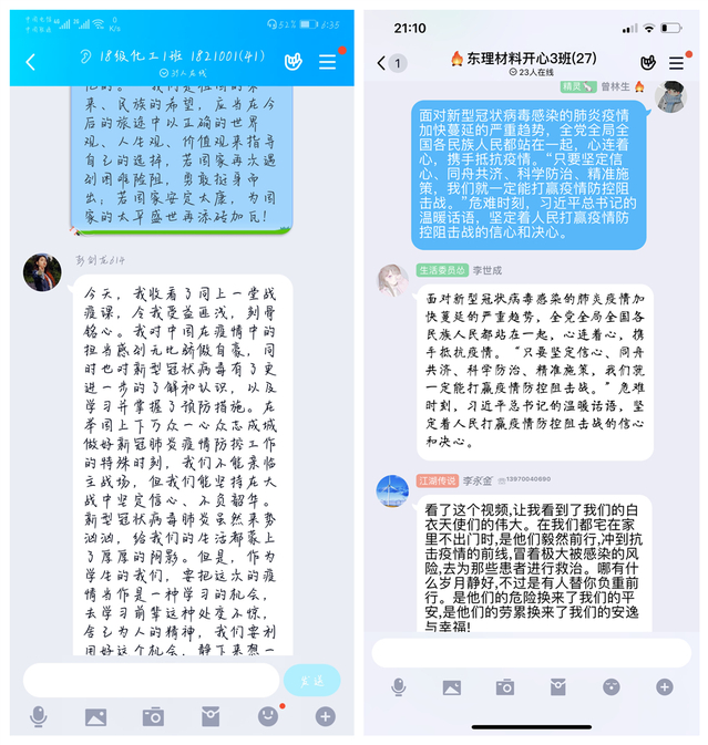 通过此次课程的学习,同学们切身感受到了祖国的强大和全国人民的团结,深刻认识到了战“疫”中的中国速度、中国力量、中国精神。在党的领导下,举国上下以最严厉的防控措施、最周密的安排部署、最忘我的奉献精神与新冠肺炎搏斗,同学们也在这堂战“疫”课中厚植爱国情,感触颇多,纷纷展开线上交流,讲体会、谈收获、话成长。