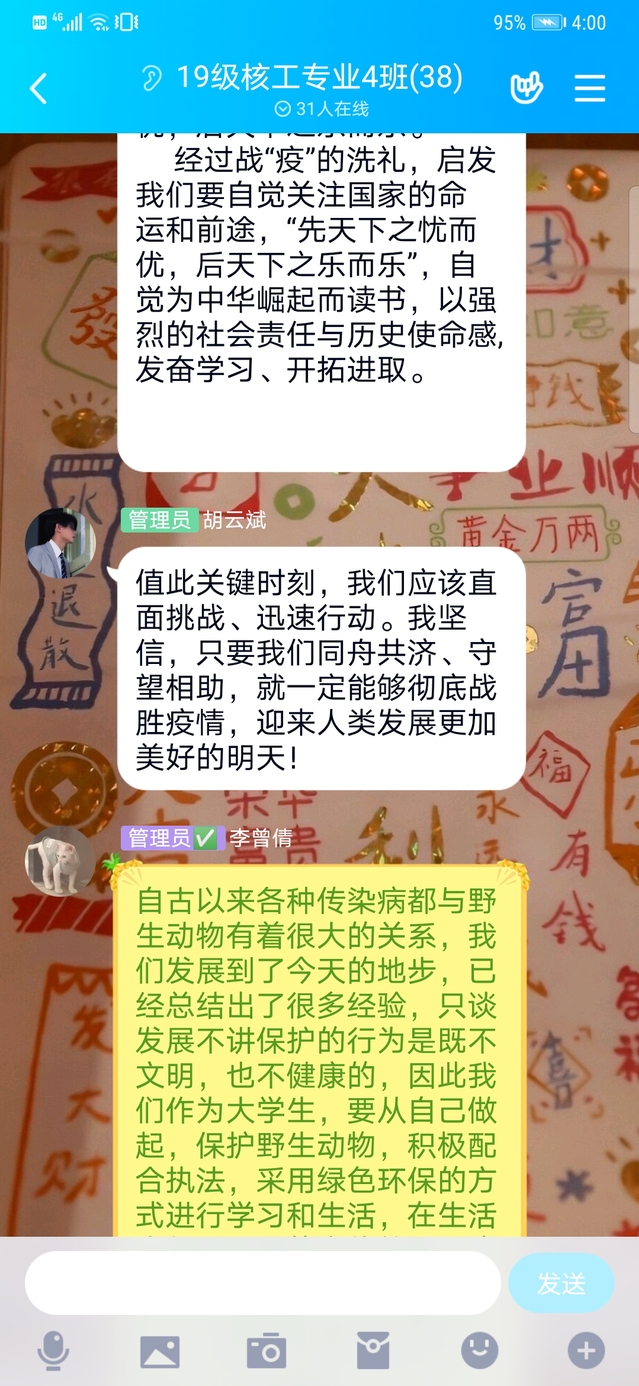 2018级的1820402班的胡政豪同学说到:疫情中,各行各业都涌现出许多“逆行者”,守护人民群众的生命健康,令人钦佩。作为新时代的大学生,要从疫情防控的一线的“逆行者”的感人事迹中,学习他们强烈的社会责任感和浓厚的爱国主义情怀,努力使自己成长为一名有理想、有担当的时代青年!
