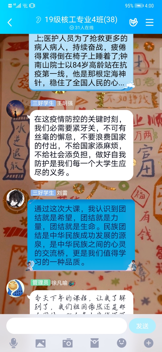 本次课程由主讲专家郭杰忠、黄恩华、张伟、周利生及特约专家程维、张文宏,结合疫情防控,讲述战“疫”一线的感人故事,分析疫情防控彰显的中国共产党领导和中国特色社会主义制度的显著优势,引导广大青年学生正确认识和看待此次战“疫”,树立责任担当意识,培育爱党爱国爱社会主义情感。直播结束后,核工学院师生在QQ群进行心得分享。