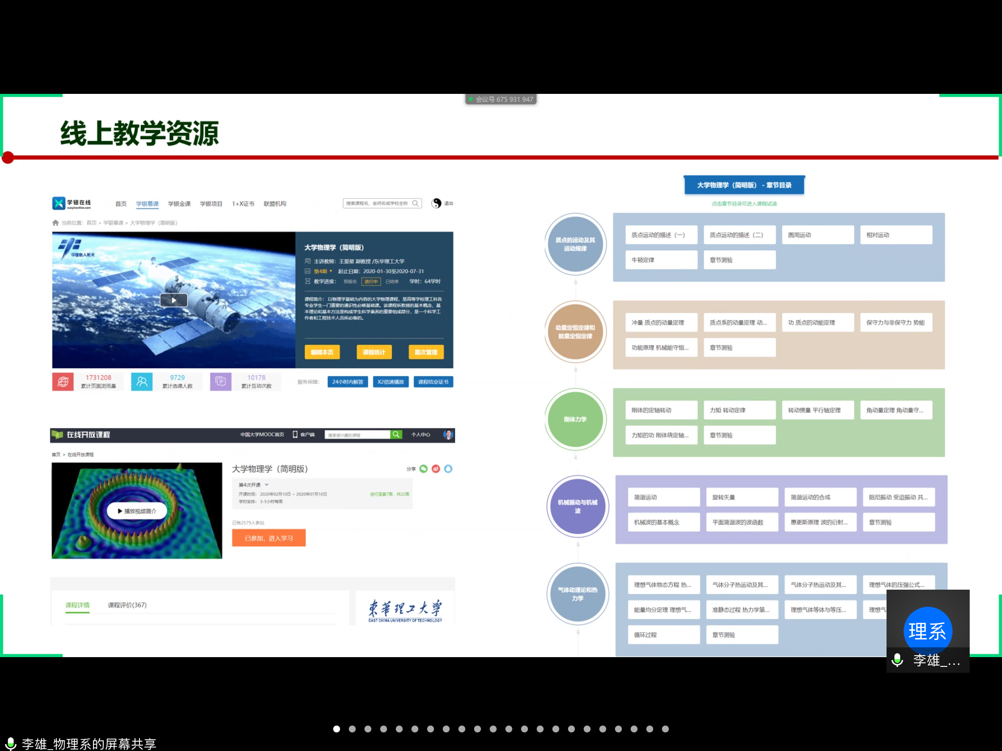李雄老师作了题为“《大学物理》在线教学经验交流”的报告,针对如何有效利用线上资源通过课前布置任务、课前话题讨论等环节,指导学生课前学习,形成针对性评价等方面进行分享。章世晅老师讲授的《大学物理》采用QQ直播教学,配合使用QQ群的“屏幕共享”功能,实现通过“PPT+有声教学”。