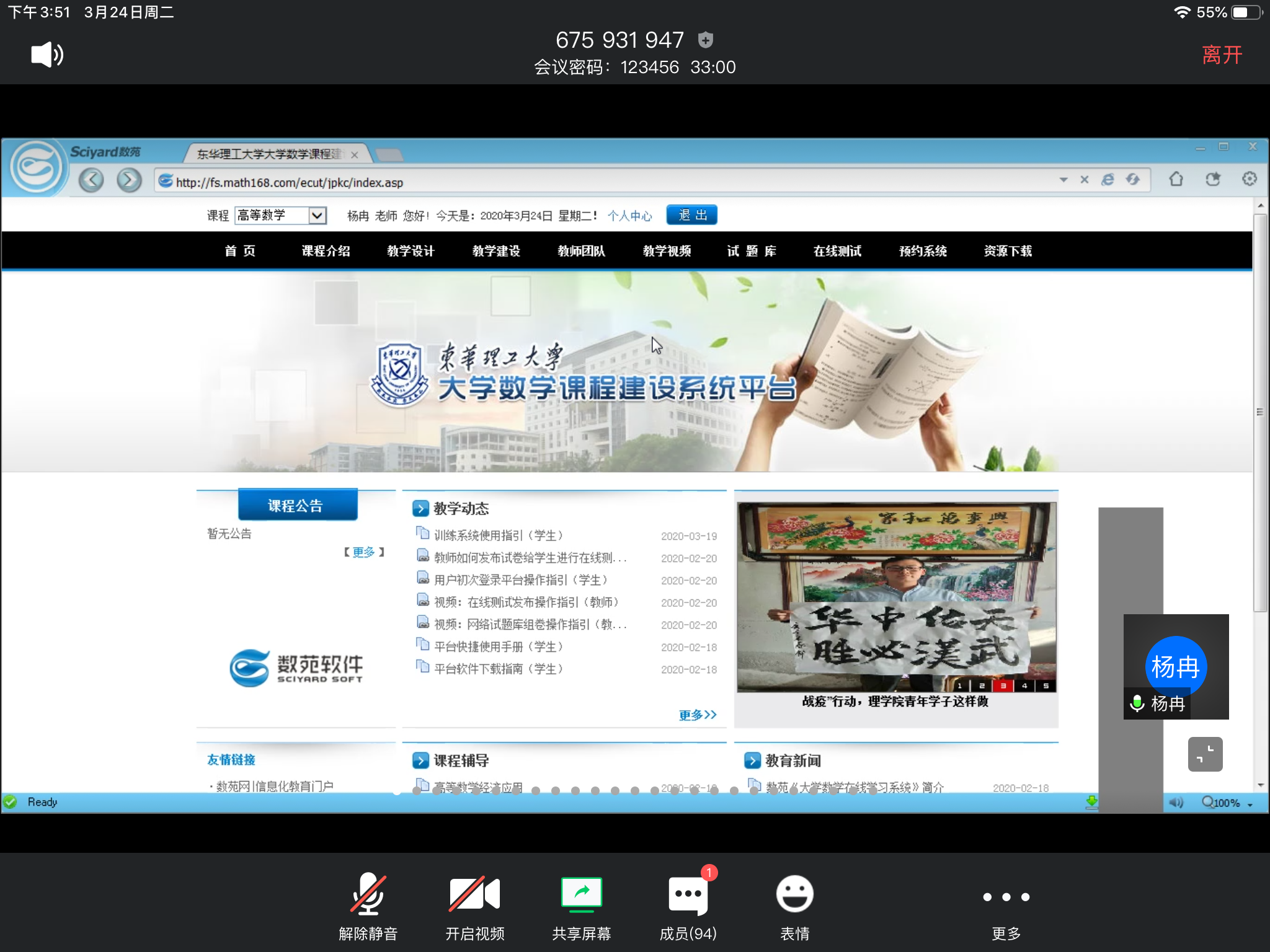 朱琳老师以《概率论与数理统计》课程为例进行经验介绍,通过腾讯会议线上直播授课、数学公式推导、直播答疑,配合线上资源,实现了优质资源与线上教学有效衔接。乐励华老师着重讲授了学习通的签到、线上课堂互动、数据统计、提交作业与笔记等功能,从而有的放矢,有针对性的辅导答疑,因材施教。杨冉老师介绍利用数学苑系统进行线上教学的经验,着重对线上作业、测试等内容做了介绍。
