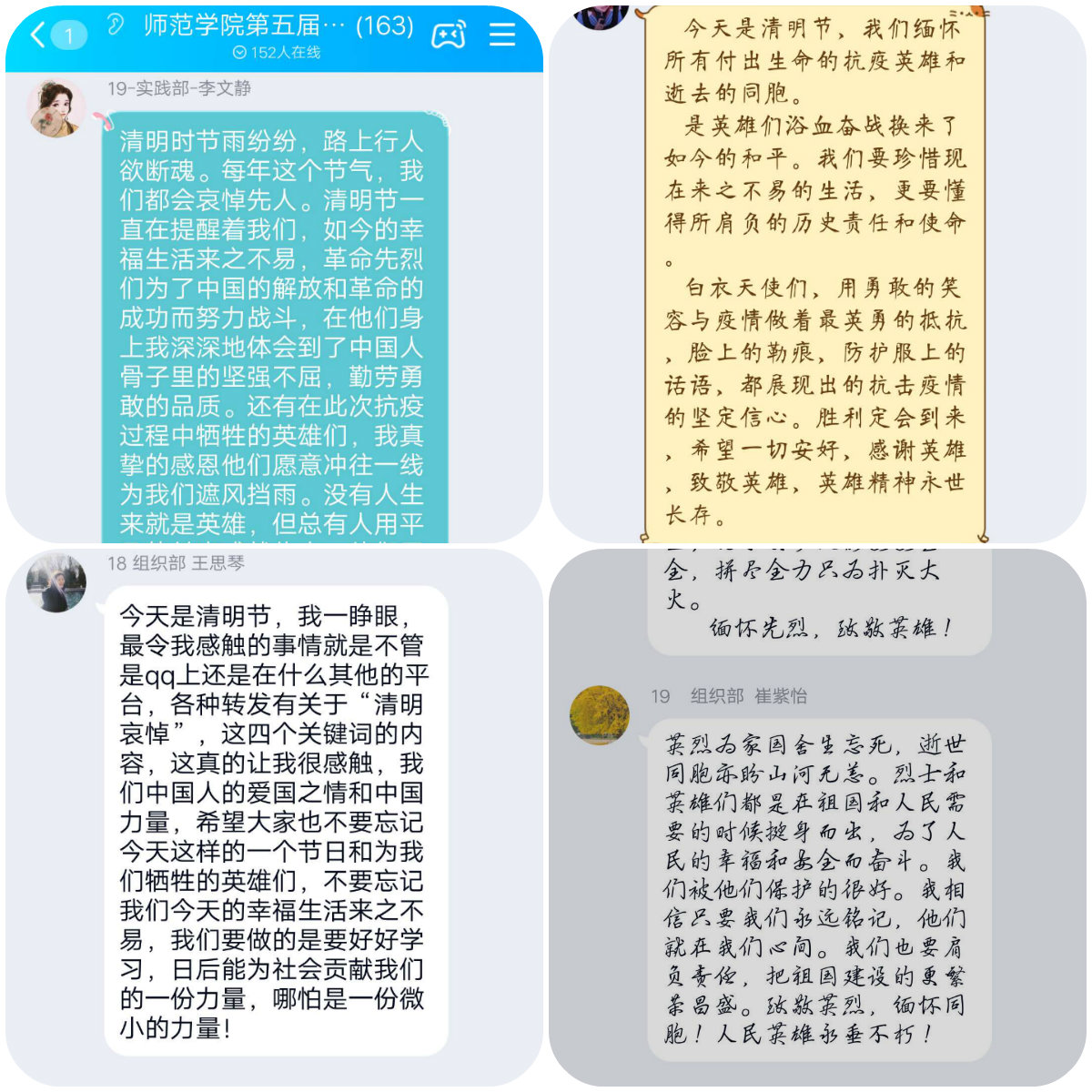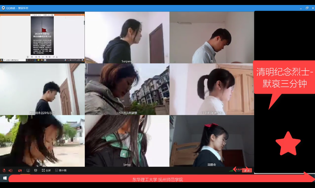 4月4日上午10点,东华理工大学抚州师范学院团委、学生会通过QQ群开展以“白云诉哀思,清明祭英烈”为主题的线上祭奠活动。活动由团委组织部王思琴主持,团委、学生会全体成员参加。