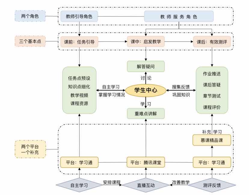 “一个中心”即教学过程中突出学生中心地位,通过课前学生自主学习疑问收集,课中重点解答,课后及时接收学生反馈,围绕学生需求进行教学设计、重点讲解、辅导答疑等安排。
