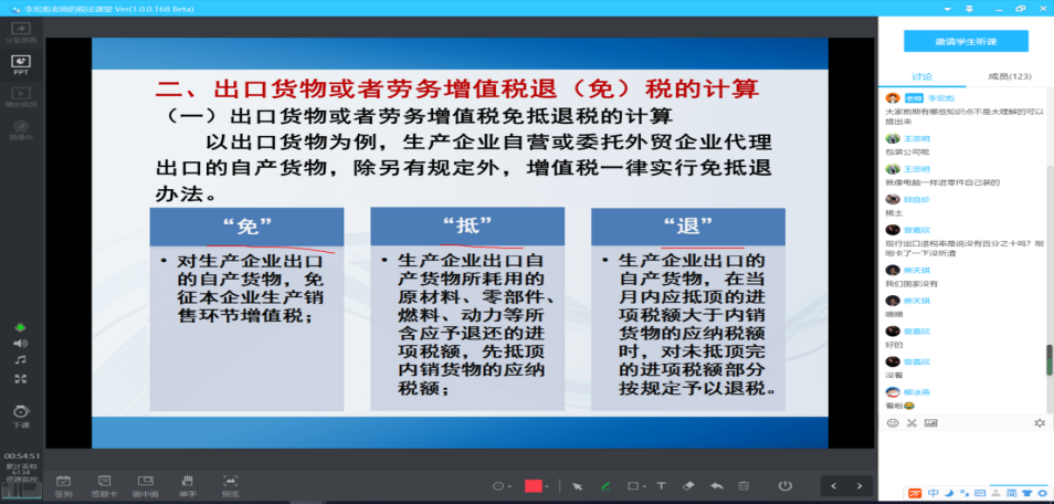 教学团队充分利用现代化教学手段,建立了“在线学习+直播互动+精品课程资源互补”的教学方法。依托学习通和腾讯课堂二个平台开展教学。学生可利用超星学习通平台进行线上自主学习。该平台《税法》课程已建成院级精品在线课程资源,由团队教师按税种录制视频40个,完成习题库、PPT、课外阅读资料等线上教学资源导入。学生除了利用本校在线税法教学资源,课程团队还链接了爱课程平台国家精品课程《中国税制》供学生互补学习。同时,教师利用腾讯课堂集中直播,针对学生自学过程中的疑问,以及课程重难点进行重点讲解。