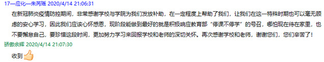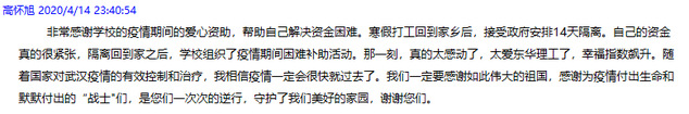 17级学生高怀旭表示:非常感谢学校的疫情期间的爱心资助,帮助自己解决资金困难。寒假打工回到家乡后,接受政府安排14天隔离。自己的资金真的很紧张,隔离回到家之后,学校组织了疫情期间困难补助活动。那一刻,真的太感动了,太爱东华理工了,幸福指数飙升。随着国家对武汉疫情的有效控制和治疗,我相信疫情一定会很快就过去了。我们一定要感谢如此伟大的祖国,感谢为疫情付出生命和默默付出的“战士们,是你们一次次的逆行,守护了我们美好的家园,谢谢你们。