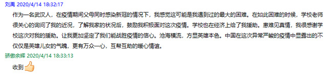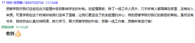 17级学生刘禹表示:作为一名武**,在疫情期间父母同时感染新冠的情况下,我感觉这可能是我遇到过的最大的困难。在如此困难的时候,学院老师很关心的询问了我的近况,了解我家的状况后,鼓励我积极面对这次疫情。学院也在经济上给了我援助。患难见真情,我很感谢学院这次对我的援助,让我更加坚定了我们能战胜疫情的信心。沧海横流,方显英雄本色,中国在这次异常严峻的疫情中显露出的不仅仅是英雄儿女的气魄,更有万众一心,互帮互助的暖心情谊。