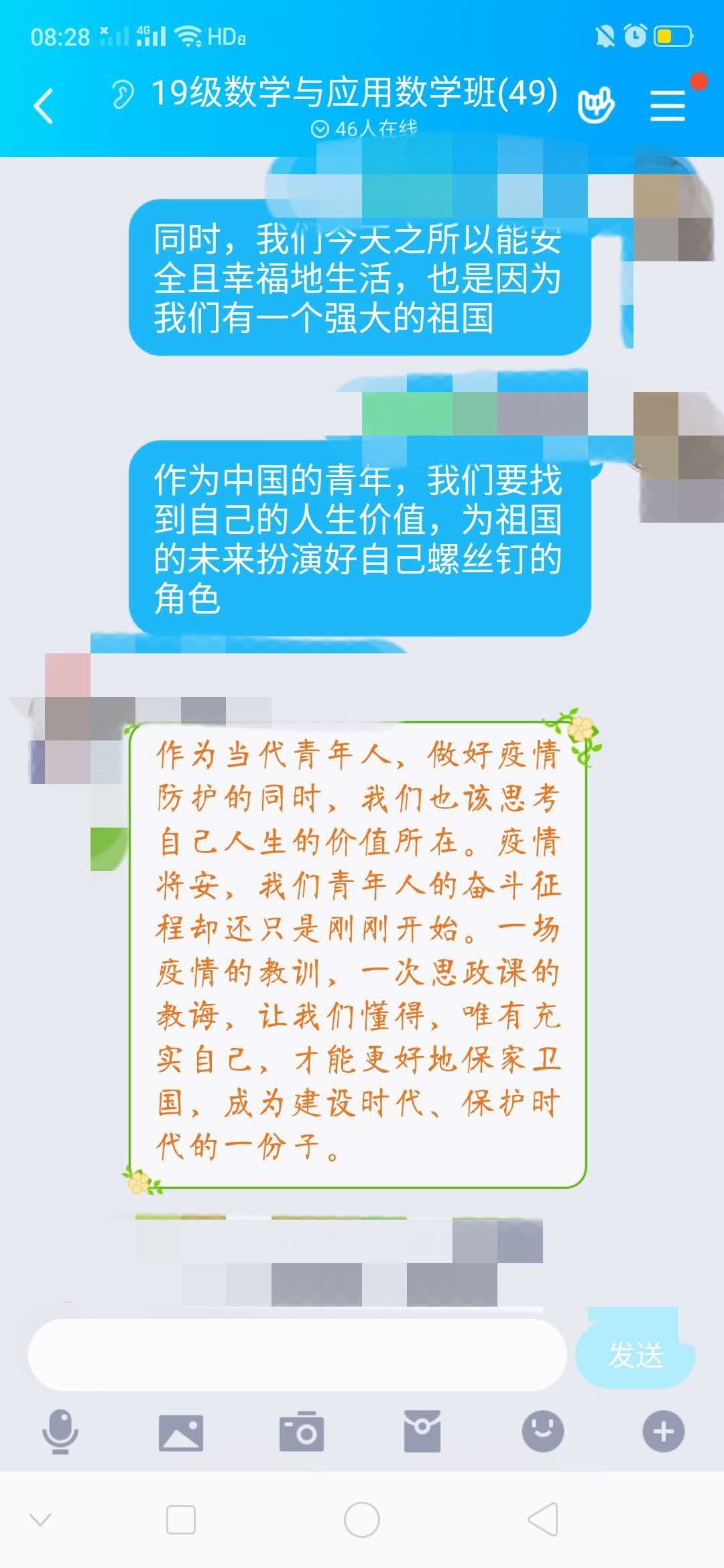19级数学与应用数学专业同学认为:作为师范生,我们应该利用大学时光好好学习专业知识,为祖国教育做出自己的贡献,这是我们师范人的使命。