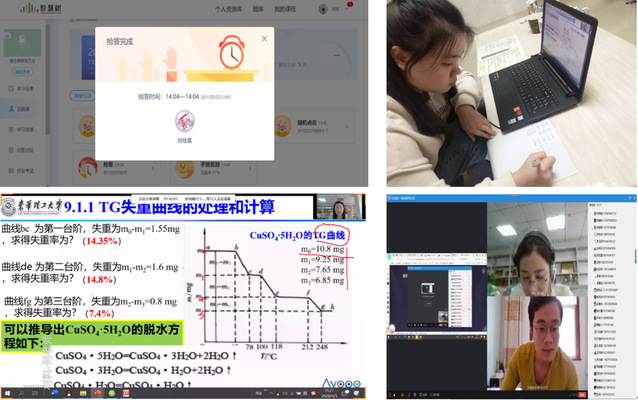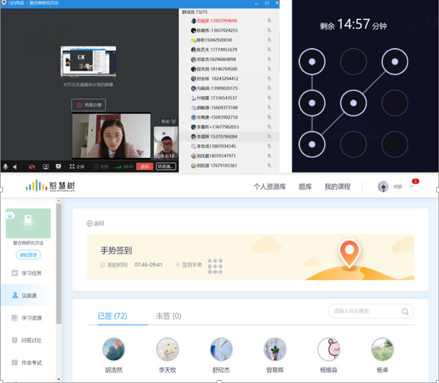 理念信念:线上课堂学习一个都不能少。何妍老师担任《聚合物研究方法》这门课程的主讲老师,授课对象为17级材料科学与工程专业的学生,学生总人数72人。她紧紧围绕 “以学生为中心”的教学理念展开教学,通过“智慧树平台+QQ屏幕共享”直播授课的混合式在线方式,进行多样化的教学。何妍老师要求学生每次上课前到智慧树平台签到,如果发现有学生没进入直播间,她会立刻通过QQ屏幕共享的电话通知学生进入“云课堂”,精准做到“一个都不能少”。