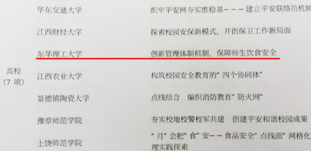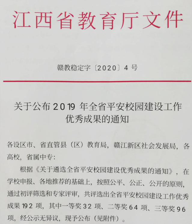 近日,省教育厅下发了《关于公布2019年全省平安校园建设工作优秀成果的通知》(赣教稳定字〔2020〕4号),由后勤保障处饮食服务中心申报的平安校园建设工作优秀成果——《创新管理体制机制,保障师生饮食安全》,荣获得全省高校一等奖。