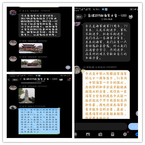 聚是一团火,散是满天星。因疫情尚未能返校的海军定向培养士官们,虽未能聚集在一起,但也以一种特殊方式,“写”下了一份特别的祝福。为了庆祝这一特殊节日,学院定向培养士官大队精心准备了海报、人民海军发展资料等组织全体海军定向培养士官进行线上学习。学员们在观看后纷纷献上自己的祝福并表达出自己立志献身国防的信心和决心。18级海军定向培养士官张金辉写道:“携笔从戎历千帆,不忘初心仍少年。未来,我们继往开来,砥砺前行!”19级海军定向培养士官吴渝写道:“不辱使命,砥砺前行。人民海军,生日快乐!您的辉煌,我们来守护。”