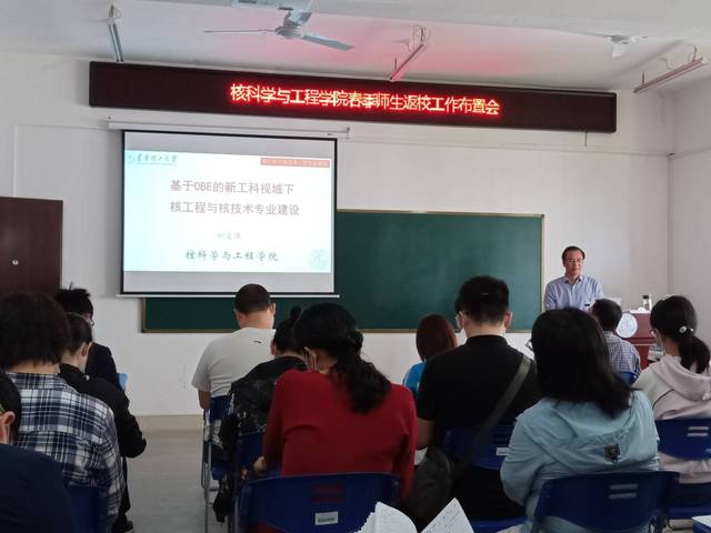 为了取得防控抗疫和学科专业建设更大胜利,刘义保院长以“基于OBE的新工科视域下核工程类专业建设”为题,从一流专业建设的主体思路和项目驱动建设二个方面,总结了15年来核专业建设取得的成果,通过教育部新工科建设项目和教育部高等学科科技规划战略研究课题申报,阐述了基于OBE的新工科建设,培育国家教学成果、争创一流专业。