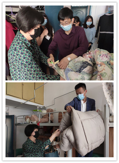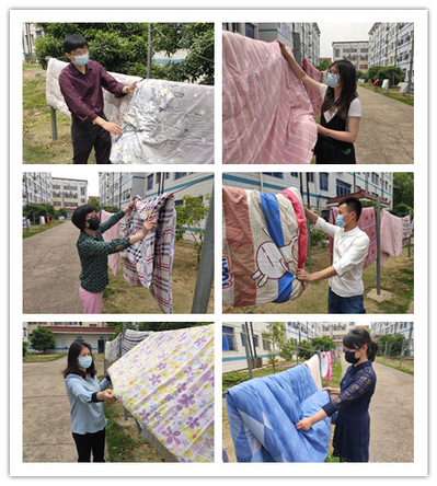 由学院党委书记李儒俊带队,学院辅导员们集体出动,从7栋到10栋,为学生打开一间间寝室门通风,替学院各班级学生晒一床床被子。为便于区分,辅导员们提前写好标签,详细标注楼栋号、宿舍号和床位号,同时还喷洒消毒液为学生的被子消毒。李儒俊说:“关爱学生是作为老师的应有之义,学院的辅导员们每天要完成1000余人的打卡督促,还给学生们晒被子,所有的一切,都是为了同学们都能够平安返校、愉快生活。”