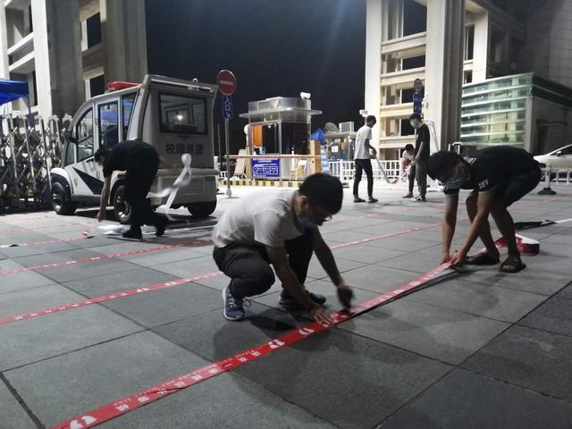 5月12日下午6点,土建学院30名毕业生党员志愿者们于广兰校区东门**并开始分配工作,在入校口、出校口等人流量密集区域剪切、粘贴标志线、搬运桌凳、搭建测温点帐篷、布置隔离栅栏、安装标志牌等。晚9点,在广兰校区东门防控布置工作完成后,毕业生党员志愿者们立即前往枫林校区参与防控布置工作,最终于晚上11点完成枫林校区返校防控布置工作。