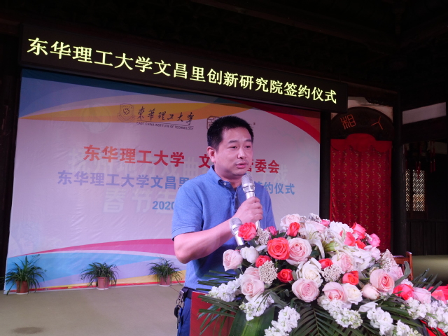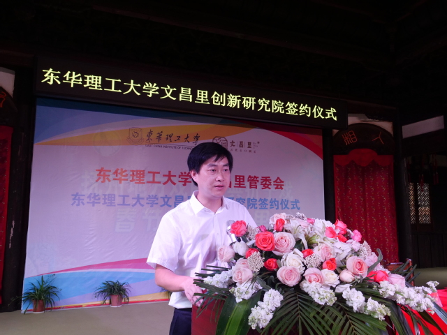 首先,艾志峰代表文昌里管委会致词。他强调:通过双方的共同努力,东华理工大学文昌里创新研究院必将成为高校服务地区发展的新典范、文昌里文化传承与发展的新标杆!