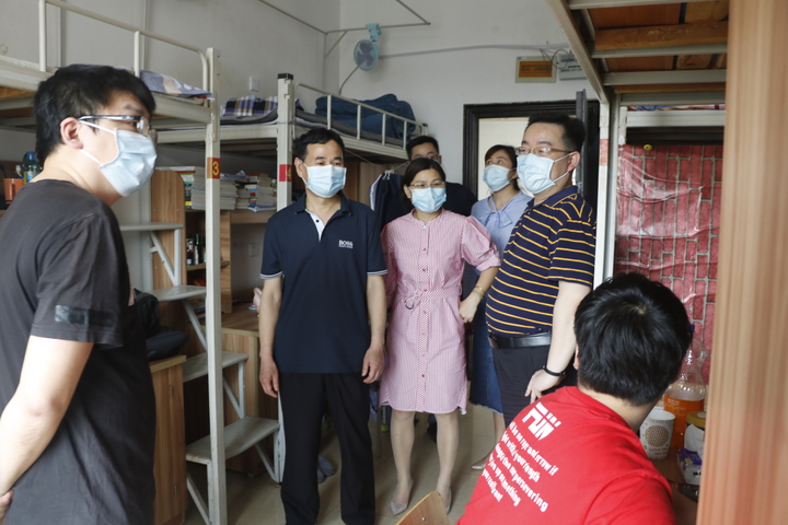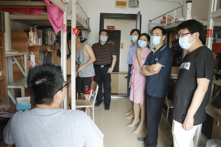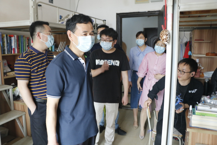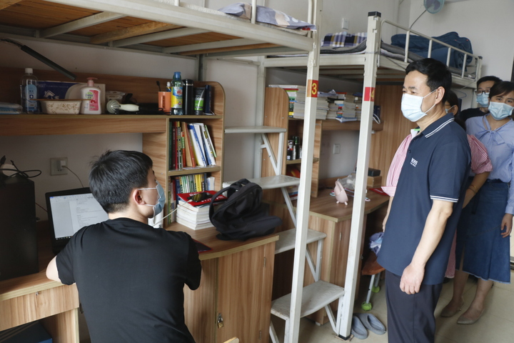 在走访学生宿舍过程中,学院领导老师对返校的同学进行了亲切的慰问。“返校之后还适应吧?”“吃饭怎么解决啊?饭菜还合口味吧?”“网上学习怎么样、效果好吗?”“在准备考研啊?准备的怎么样啦?”“一定要遵守学校的防控规定,做好防护措施哦”、“一定要保护好身体,也要关心照顾宿舍的同学”、“有什么困难就跟学院讲”......通过温馨的交谈了解学生的学习和身体情况及返校以后的食宿情况,叮嘱他们一定要遵守学校防控的各项规定,注意自我防护,并希望大家认真学好本学期的课程。