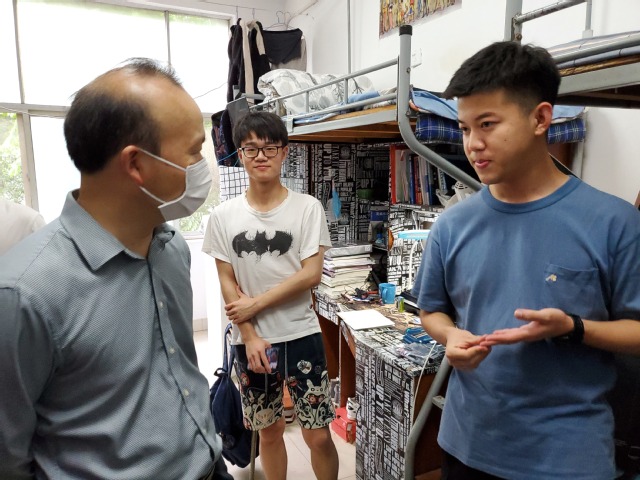 在看望期间,每走进一间宿舍,陈焕文都亲切地与同学们进行交流,仔细地询问每位同学返校后的适应状况以及专业学习情况。他首先代表学校向同学们表达了亲切的问候,并希望同学们一是要深刻认识当前疫情防控工作的紧迫性、严峻性和重要性,做到思想上高度重视,认识上高度统一,行动上高度自觉;二是要理解学校在当下为了保障学生健康平安而做的种种努力,积极配合学校、学院一起打赢这场疫情防控阻击战;三是要保持乐观向上的心态面对当下疫情期间的就业、升学压力,全力以赴准备好研究生复试;四是要保持良好的学习生活作息规律,在生活学习上,如果有遇到任何困难,欢迎同学积极向学院反映问题、提出建议。