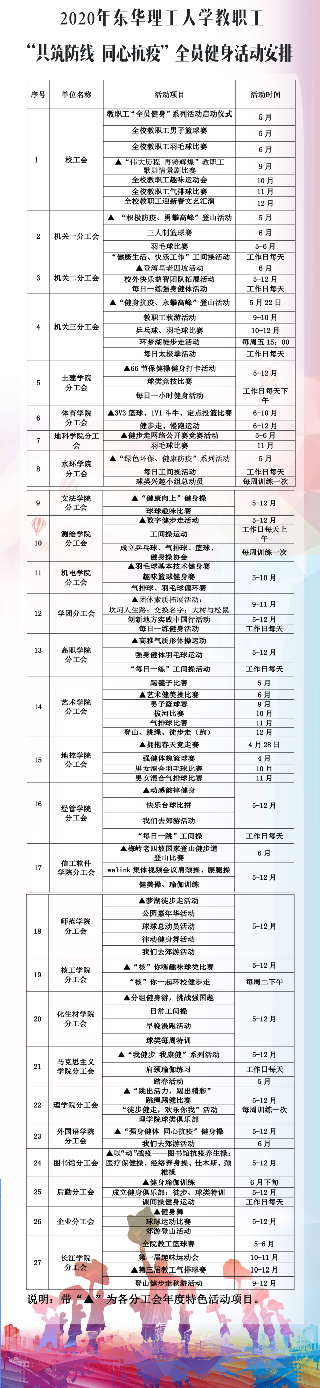 立足疫情防控,倡导健康文明、绿色环保的生活方式,助力打赢疫情防控阻击战。坚持以人为本、注重实效、业余自愿、户外为主、小型多样、因地制宜、因人而异、适时适度”的原则。根据不同年龄、不同性别、不同身体状况和不同兴趣等个体特点,教职工自主选择健身项目,自行掌握健身强度和健身时段(如:早、晚、课外或其它业余时间) ,突出活动的科学性、健身性、趣味性,最大程度地引导教职工全员参与。原则上每位教职工至少报名参加1项健身活动,每周参加健身锻炼至少3次,每次至少30分钟。