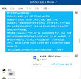 网络直播、教学视频、慕课、分组互动……《大学生创新创业基础》教学团队因课制宜,开展多样化“云端教学”,课程教学团队采用自建和引用相结合的建课形式,为学生提供精彩生动的网络直播、精选优质适用的教学视频,对于课程的难点、重点实时解释答疑,师生配合默契,学习效果良好;同时借助微信和QQ群多渠道沟通平台,实现教师间教学经验分享,师生间课程交流和互动,学生间分组团队式讨论,保证每一位学生课堂“不掉线”,学习“不掉队”。