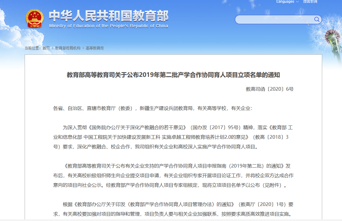 · 6月11日,教育部高教司发布了《教育部高等教育司关于公布2019年第二批产学合作协同育人项目立项名单的通知》(教高司函〔2020〕6号),我院入选项目3个。获批立项项目类别涵盖“教学内容和课程体系改革”“师资培训”和“创新创业教育改革”3个方面。