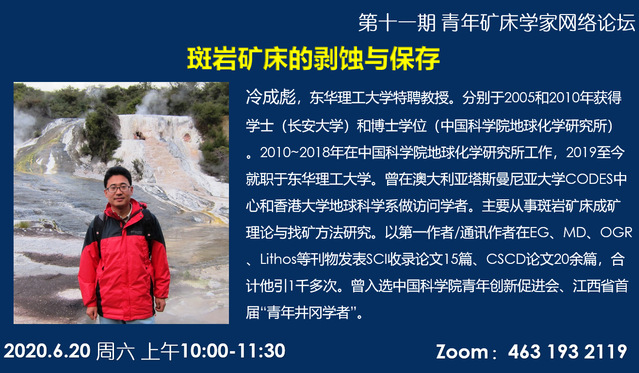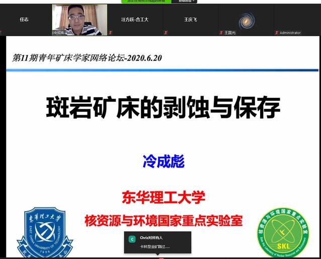 核资源与环境国家重点实验室冷成彪教授受邀参加第十一期青年矿床学家网络论坛,该论坛以及时分享最新学术动态,展开思想碰撞和学术讨论为宗旨,邀请优秀青年矿床学者做报告,并进行广泛问答交流。第十一期论坛邀请了中国地质大学(北京)的王庆飞教授以及来自东华理工大学的冷成彪教授作学术报告,由合肥工业大学汪方跃副教授主持,参会人员超过330人。