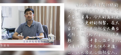 学院党委书记李儒俊用四颗“心”勉励所有的毕业生:一是以平常心做平常人,在竞争时代平凡但不平庸;二是以包容之心做社会人,海纳百川,包容但不放纵;三是以快乐之心做学习人。家财万贯,不如薄技在身,学习但不迂腐;四是以责任之心做职业人,有职业才有生存的平台,尽职但不贪欲。