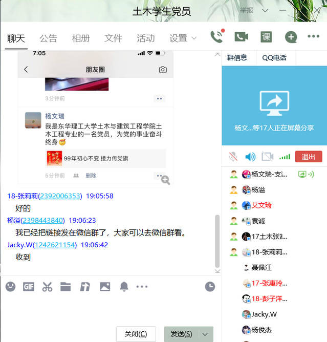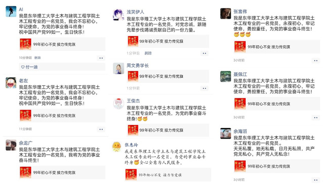 最后,在支部书记杨文瑞的倡导下,学生党员们纷纷在朋友圈转发人民网《99年初心不变 接力传党旗》专题报告文章,并表示自己作为东华理工大学土木与建筑工程学院土木工程专业学生党支部的一名党员,在未来的生活中,定将不忘初心,牢记使命,为党的事业奋斗终身。(图文/杨文瑞,张莉莉 审核:漆萱环 )