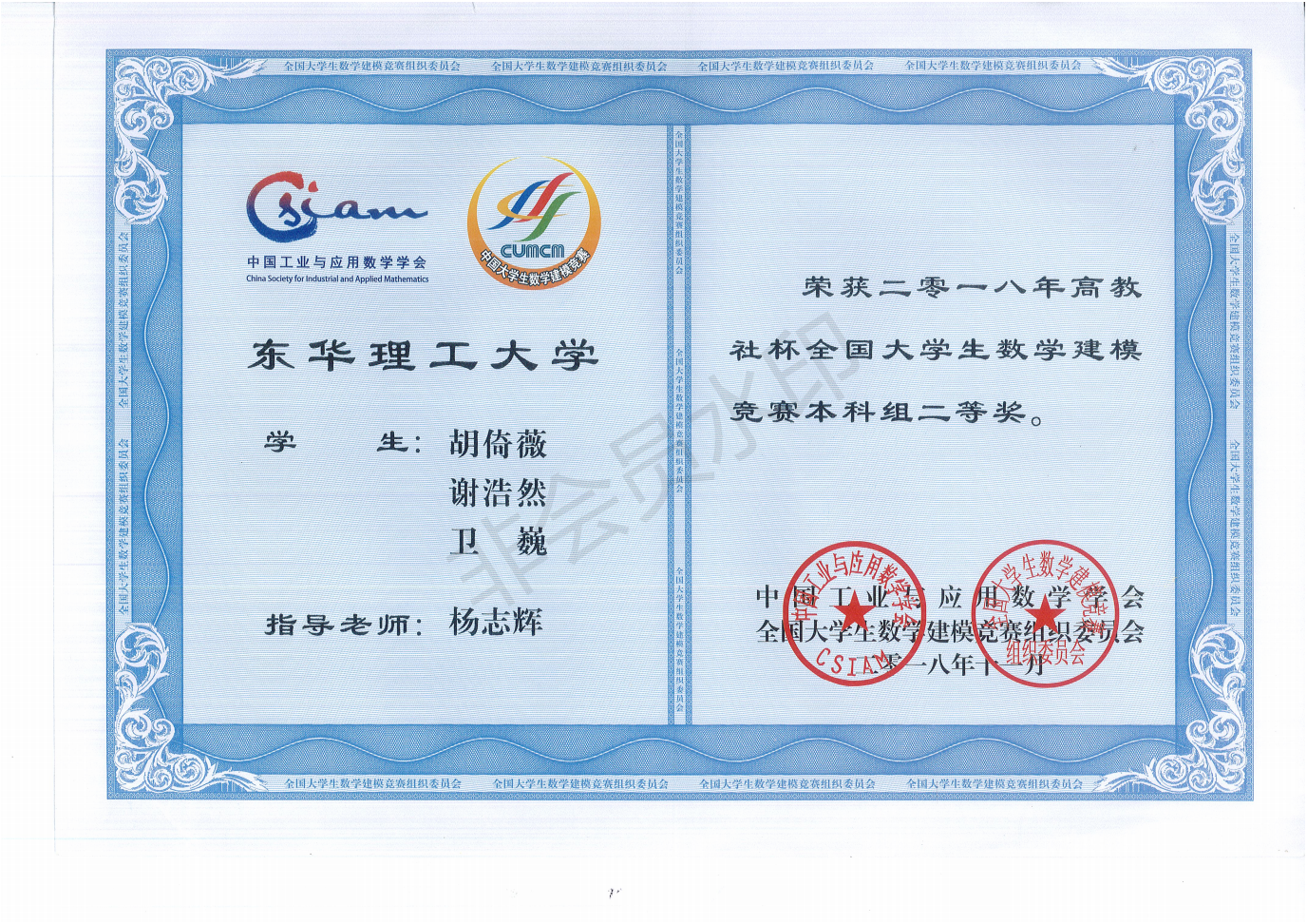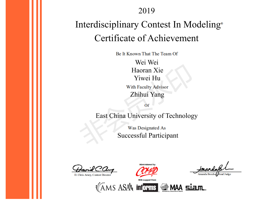 第三学期,一位机电学院的大三学长到理学院寻找美国大学生建模比赛队友,虽然是第一次听说这个比赛,但本着锻炼自己的初心积极入队。寒假跟随着学长学姐们一起留校培训,那是第一次接触到什么是算法,看专业英文论文,安装使用latex等软件。在团队共同努力下最终获得H奖。