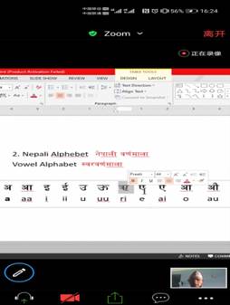 开班仪式结束后,尼泊尔特里布文大学Ramhari Lamsal老师开始了开班第一讲——《尼泊尔口语》课程的授课工作,Ramhari Lamsal采用示范朗读和逐一领读等方式,让参训学员们从尼泊尔单词的发音开始学习,学员们饶有兴趣的进行跟读,他严肃认真而又幽默风趣的教态,激发了大家学好、说好尼泊尔语的自信心。
