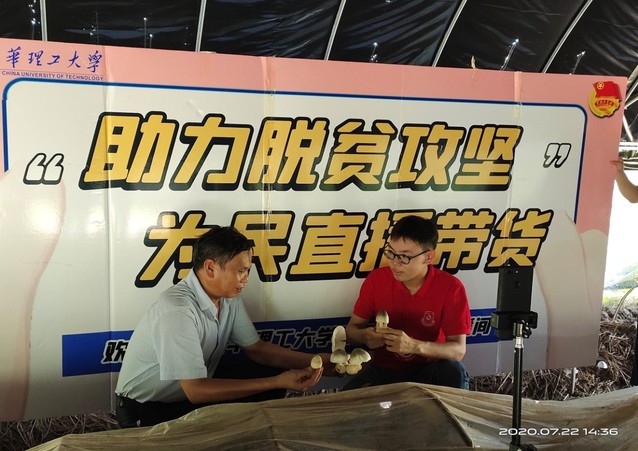 2020年7月22日上午,以东华理工大学化学生物与材料科学学院黎川产业研究院李荣同教授为带头人的“菌”民融合双创团队在黎川县乡依侬消费扶贫产品体验馆开展了一次生动火爆的直播带货活动。黎川县副县长陈华兴、东华理工大学挂职黎川县科技副县长石俊副教授、东华理工大学校团委书记曾华、创新创业学院党委书记王合义、化学生物与材料科学学院党委副书记马建国教授等到场助力直播活动。活动借助微信看点直播平台直播销售当地著名特产-干草菇、茶树菇、芭蕉芋粉等农产品。长期为当地农民蘑菇种植提供技术支持的全国模范教师李荣同教授现身直播现场,不但从专业的角度给网友们介绍了各类大型菌菇的药用价值,而且详细讲解了烹饪方法,当天的直播效果明显,平台观看人数达上千人,网友们在直播间里热情留言并下单抢购。