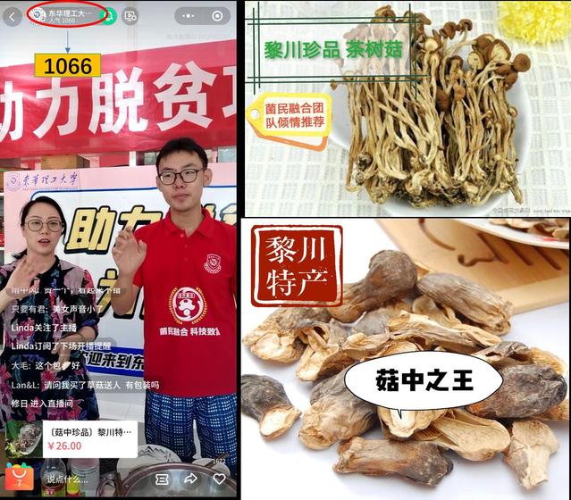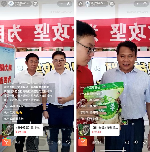 7月22日上午10:30,东华理工大学化生材学院“农民教授”李荣同、黎川县挂职副县长石俊携手“菌”民融合团队00后大学生高鉴杭与胡代鑫化身“网络主播”,打造县长、教授、大学生三合一体化推介黎川地方特色品牌的试、听、品盛宴,让优质农产品搭上互联网直播的“顺风车”。
