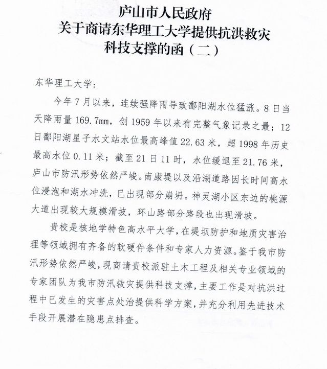 自7月以来,连续强降水导致鄱阳湖水位猛涨,我省庐山市防汛形势严峻。由于长时间高水位浸泡和湖水冲刷,庐山市南康堤以及沿湖道路段出现部分崩塌,庐山市区神灵湖小区东侧桃源大道路段出现较大规模滑坡,环山路约400米路段也出现滑坡,情况危急。7月23日,应庐山市人民政府商请,由科研与科技开发处处长李栋伟同志带队,土木与建筑工程学院查文华、李明东、薛凯喜、梁海安及测绘学院王胜平等专家一行6人,携带专业设备赴庐山市区对桃源大道及环山路出险地段开展科技防汛救灾现场应急指导工作。