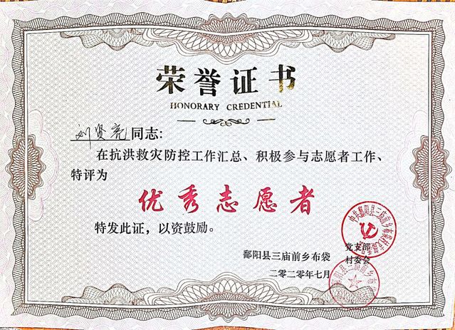 每天早晨7:00,刘贤亮就开始了一天的工作,随防汛志愿者一同下圩巡查水位等情况。按照分工要求,刘贤亮早晚需对圩内水位进行测量,清理圩堤泥地中的障碍、杂草等杂物,仔细地巡查圩坝两侧是否存在管涌、泡泉等险情。若有险情发生,按照程序在立即上报的同时,需要配合解放军官兵封堵泡泉。工作中,刘贤亮不怕苦、不怕累的精神,得到了乡防洪办及防汛人员的一致认可,村委会专门对刘贤亮等防汛志愿者进行了表彰,感谢他们为防汛工作做出的贡献。