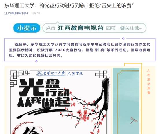 编者按:勤俭节约是我国传统美德。东华理工大学文法学院开展“2020光盘行动,拒绝‘剩’宴”系列活动,认真贯彻落实习近平总书记关于厉行节约、反对铺张浪费的重要批示精神,弘扬中华民族尊重劳动、勤俭节约的传统美德,坚决制止餐饮浪费行为。人民网、江西教育电视台等媒体对此进行报道,引发社会广泛关注。现将报道原文转载如下: