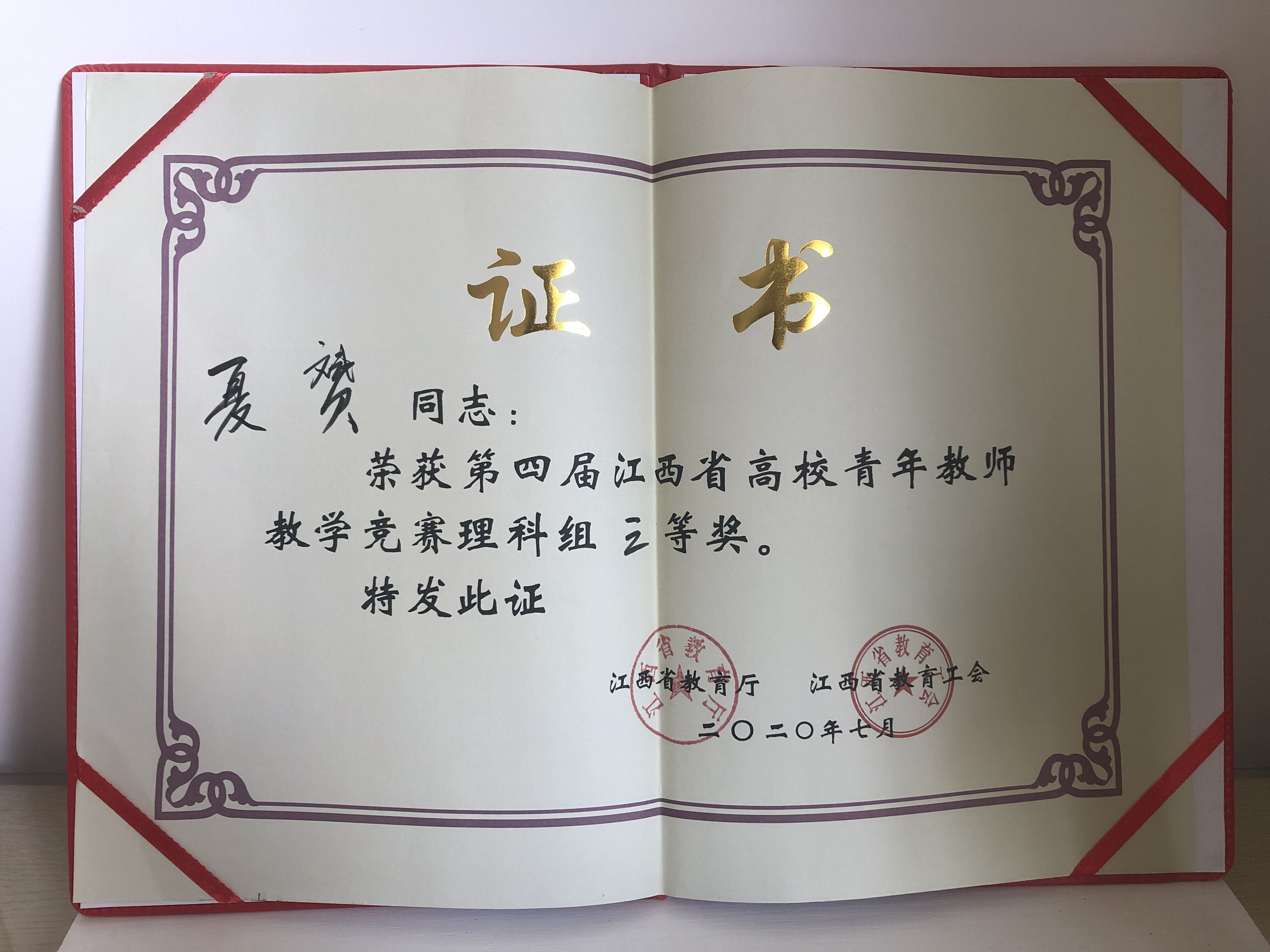 7月29至31日,由江西省教育工会和江西省教育厅联合举办的第四届江西省高校青年教师教学竞赛决赛在江西财经大学举行。在为期三天的比赛中,来自全省68个大专院校层层选拔推荐的191名优秀参赛教师同台竞技。大赛分文科、理科、工科、医科、思政专项五个组别。经过激烈竞争,严格评审,我院青年教师夏赟获理科组三等奖。夏赟老师潜心教学,曾在由教务处、高等教育研究与评估中心、教师发展中心、宣传部、校工会联合组织的2019年青年教师教学竞赛中斩获一等奖。
