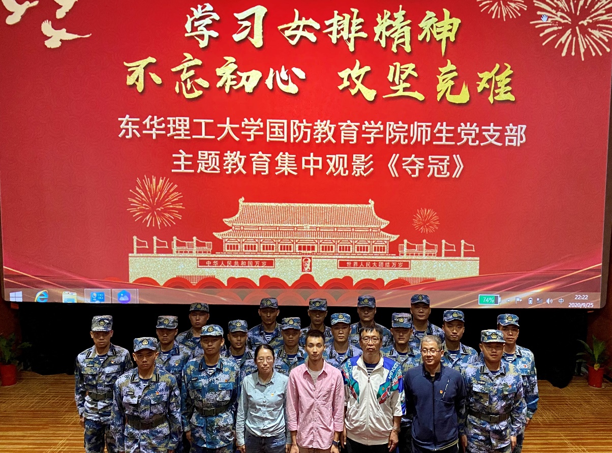 女排精神历久弥新,燃遍华夏大地。“扎扎实实,顽强拼搏,无所畏惧,攻坚克难,同甘共苦,团结合作,勇攀高峰”,女排精神不仅是我国竞技体育的一笔财富,俨然成为了中华民族的一面精神旗帜。2020年9月25日晚八点,为树立“不忘初心,攻坚克难”的顽强意识,学习女排精神。国防教育学院师生党支部组织全体党员同志观看了爱国电影《夺冠》。
