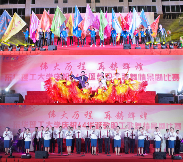 东华理工大学为核成立、因核成名、以核成势。60余载披荆斩棘、功业千秋;60余年风雨砥砺,薪火相传;60余年春风化雨,春华秋实。64圈年轮,记载着时间的沧桑和峥嵘;64载春秋,铭刻着步履的铿锵与荣光。10月14日,在学校即将迎来64岁生日之际,我校教职工精心编排了一台“伟大历程 再铸辉煌”庆祝64华诞歌舞情景剧晚会。校党委书记柳和生、校长孙占学、党委副书记刘紫春、副校长郭福生、副校长聂逢君与两千余名师生共聚一堂,欢歌起舞,向东华理工献上最深情的告白与美好的祝福。