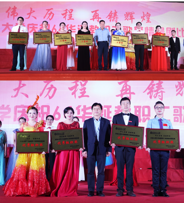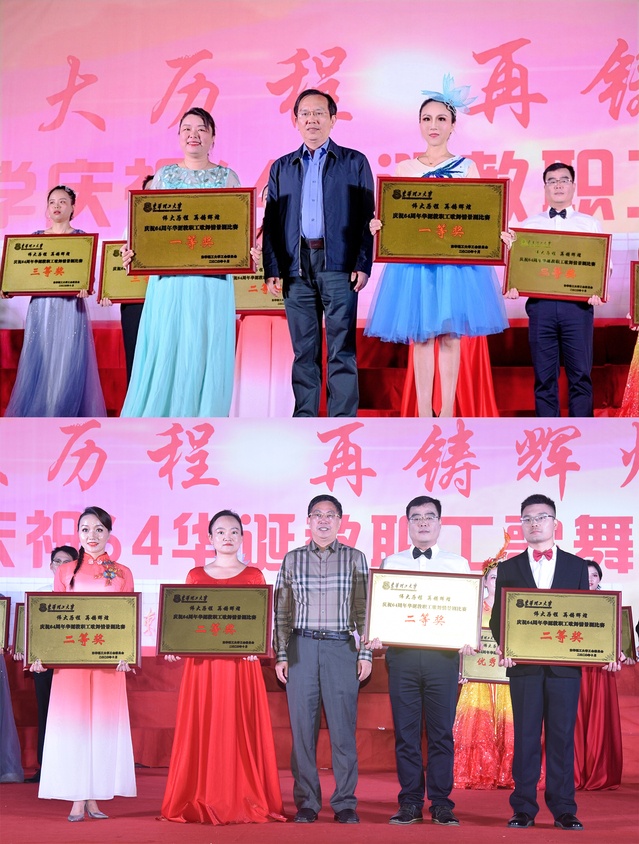 晚会现场邀请到江西省歌舞剧院院长杜欢;江西省文化演艺发展集团艺术发展部部长詹凯;江西广播电视台《新闻晚高峰》等栏目主播姚皓,担任嘉宾评委。晚会最后还进行了颁奖仪式,校领导为获奖代表颁奖。机关一、艺术学院分工会获得一等奖;机关三、企业、高职分工会联合组队,学团、马院、图书馆分工会联合组队,软件与信工、土建分工会获得二等奖;地科、测绘、文法、外语、水环、化生材分工会,体育、核工、后勤分工会联合组队获得三等奖;经管、地控、师范、理学院分工会获得优秀组织奖。