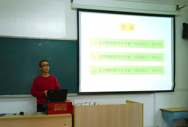 吕波老师汇报了大学物理课程思政建设情况,包括成立大学物理课程思政建设团队,修改大学物理课程目标,增加思政教育目标,深入挖掘大学物理的思政素材,对每一知识单元教学重新进行设计,加入思政素材,并在课堂教学中努力践行思政教育。
