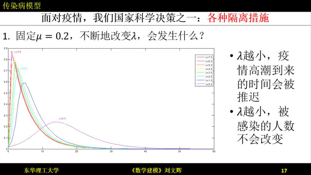 刘文辉老师以“传染病模型”为教学案例,详细介绍了两个传染病模型,并将其与新冠疫情的抗疫措施相联系。从数学模型的角度阐述了“群体免疫”可能带来的严重后果,解释了“隔离措施”和“医疗体系建设”的必要性和科学性。