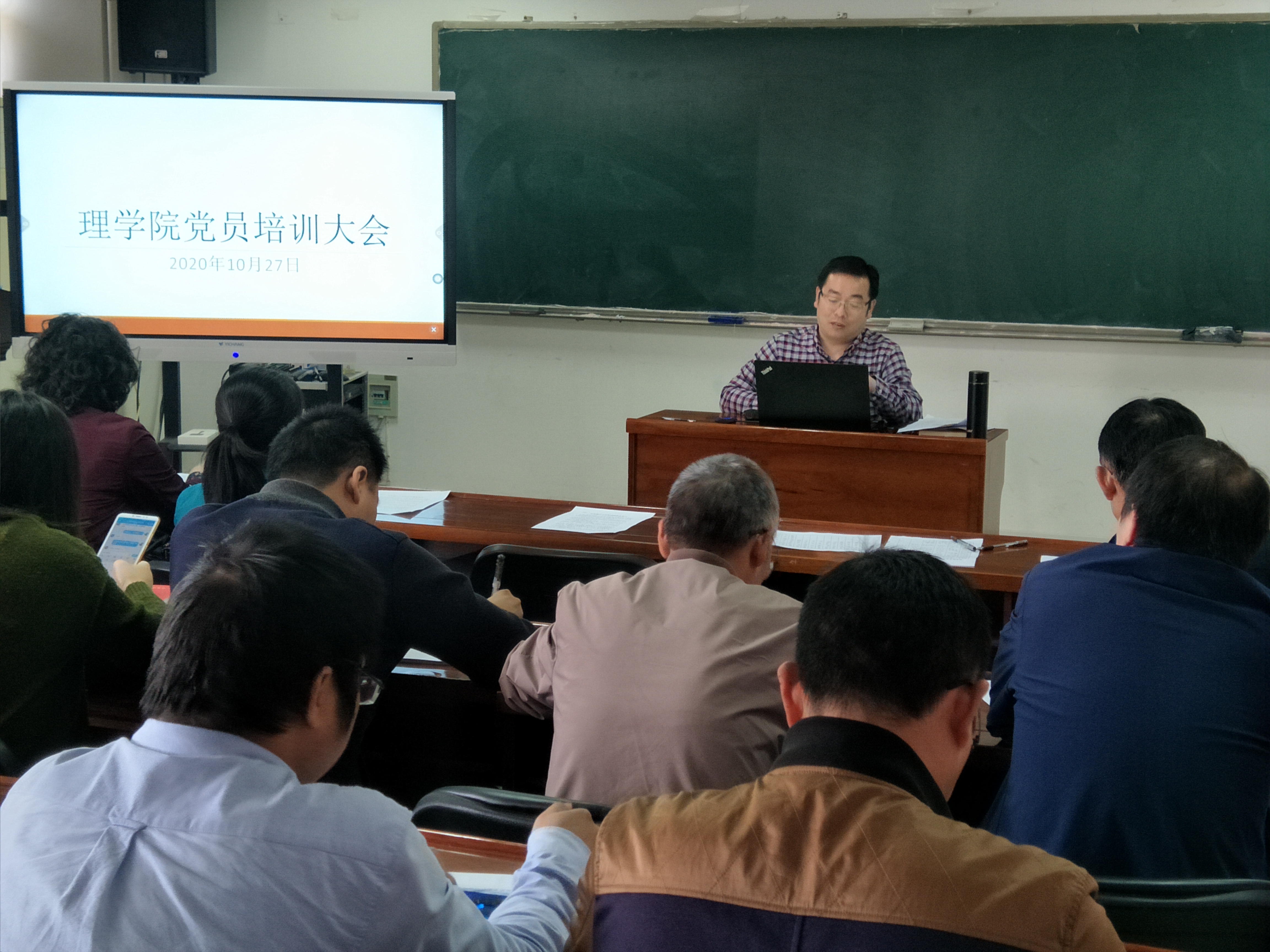 为贯彻落实中共中央《关于巩固深化“不忘初心、牢记使命”主题教育成果的意见》,按照《2019-2023年全国党员教育培训工作规划》规定,根据校党委组织部的统一部署,理学院党委安排了全院党员的集中培训工作。2020年10月27日下午,理学院党委组织全院教工、学生党员在核工楼1216报告厅开展了第二次集中培训工作,本次培训由理学院副院长李迎主持。