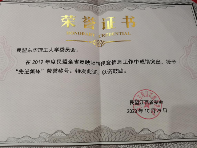 在10月29日召开的民盟全省社情民意工作表彰暨培训会上,民盟东华理工大学委员会被授予反映社情民意工作“先进集体”,成为四个省直先进基层组织之一;盟员张再芝被授予“优秀信息员”光荣称号。